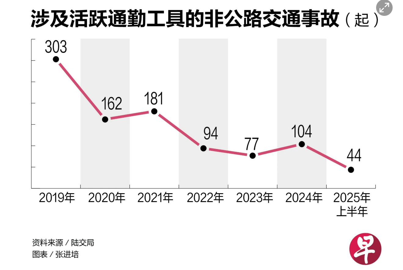 根据陆交局提供给《联合早报》的数据,截至2025年10月31日,本地已有超过5万5000名骑行者通过理论测验。数据也显示,2019年至2024年,本地每年平均发生153起涉及活跃通勤工具的非公路交通事故。